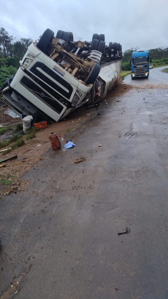 Acidente grave, caminhão perde o controle e capota na curva do Rio Sucuruína.