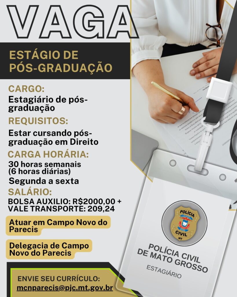 🎓 Quer dar um passo gigante na sua carreira jurídica? A sua chance chegou! 👩⚖️👨⚖️ A Polícia Civil de Mato Grosso está com vaga para estágio de pós-graduação em Direito em Campo Novo do Parecis. 💼 Confira os detalhes:✔️ Carga horária: 30h semanais (6h por dia)✔️ Segunda a sexta✔️ Bolsa auxílio: R$ 2.000,00✔️ Vale transporte: […]