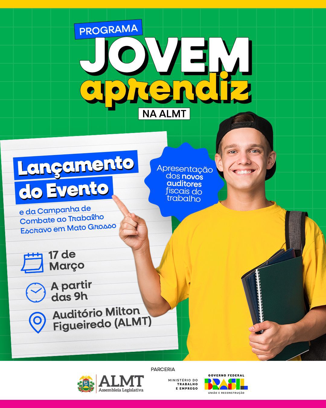 Também será realizada a assinatura de um termo de cooperação entre o Ministério do Trabalho e a Assembleia Legislativa, reforçando a parceria institucional voltada à promoção da aprendizagem e ao enfrentamento do trabalho análogo à escravidão.